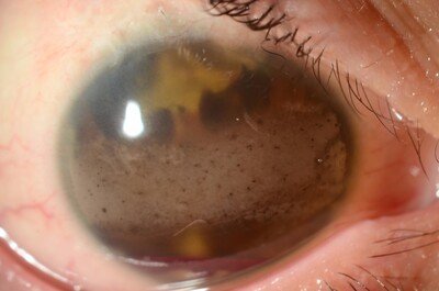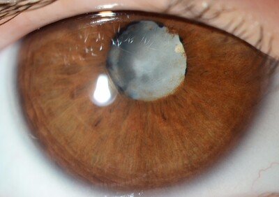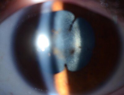 Ojo blanco con sinequias posteriores y catarata blanca.