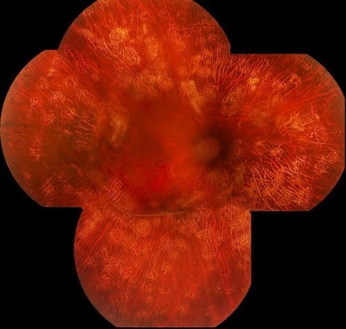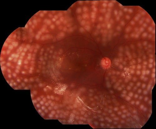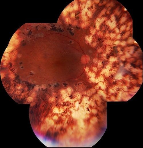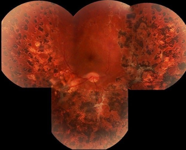 Aspecto del fondo de ojo luego de vitrectomia y endolaser.