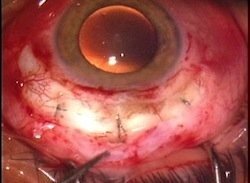 Figura 1 a y b. Antiguamente vitrectomía por 20G con suturas de la esclera y apertura conjuntival posteriormente cerrada con puntos.