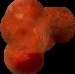 Figura 3. Proliferación vítreo retinal (PVR) con membranas pre retinales, desprendimiento de retina total y desgarros retinales.